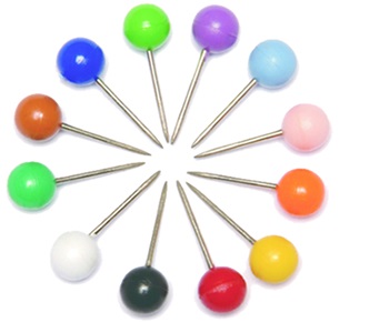 Alfinetes para mapa fabricados em aço niquelado com cabeça plástica colorida (12 cores).