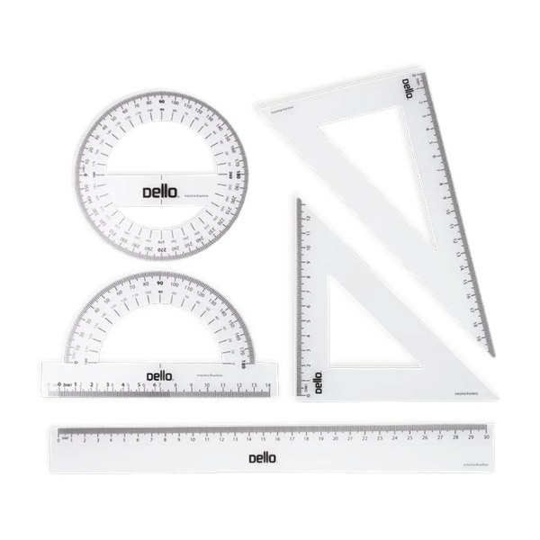 Composto por 01 Régua de 30cm , 01 Transferidor 180°, 01 Transferidor 360°, 01 Esquadro 60°, 01 Esquadro 45°.