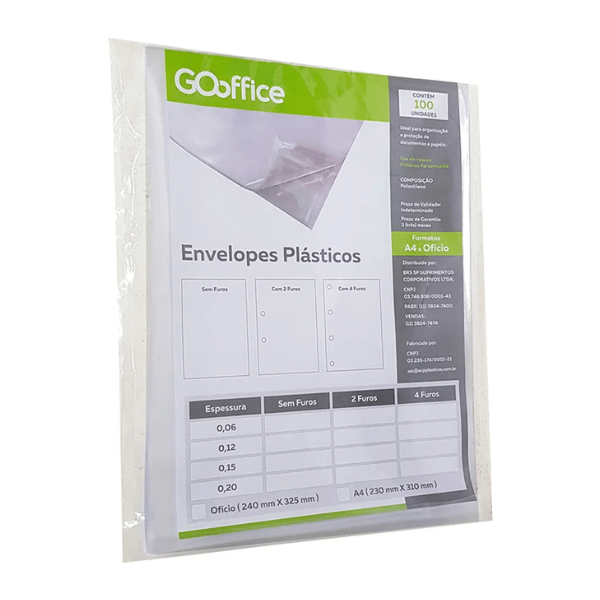 O envelope plástico Go Office é ideal para proteção de documentos e papéis, podendo ser utilizado em pastas catálogos e fichários.